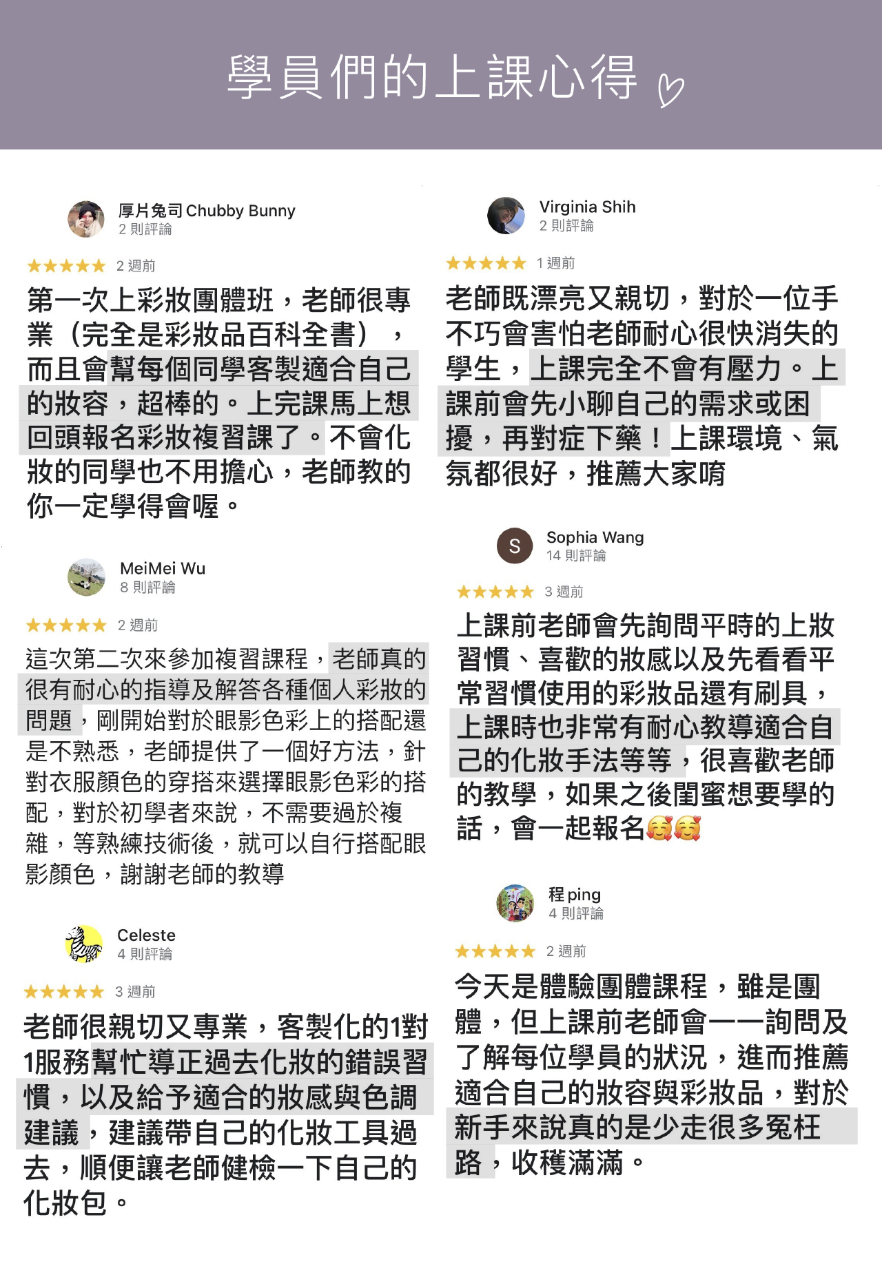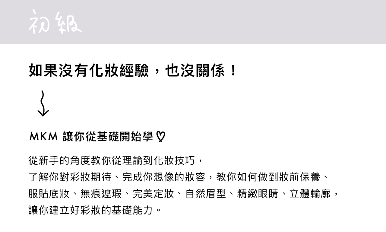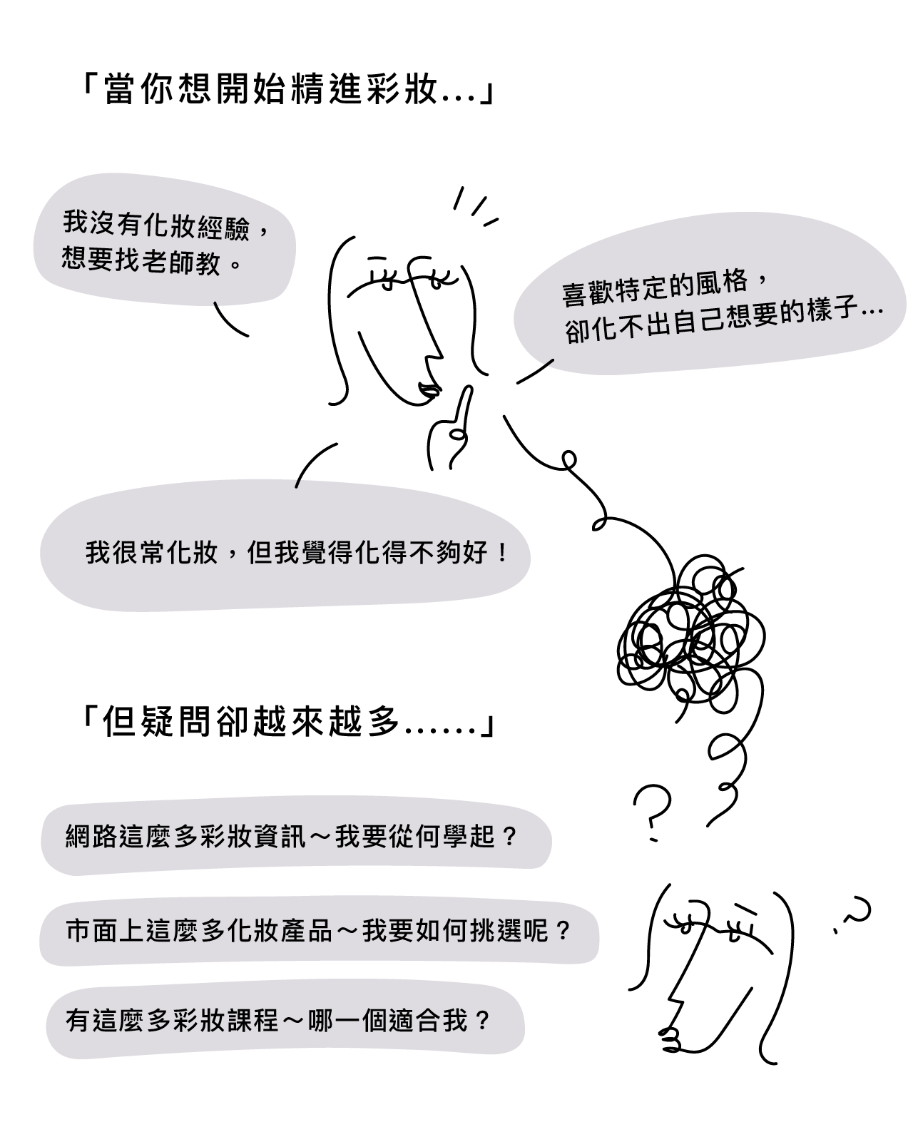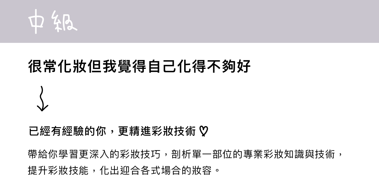|個人彩妝教學| 全方面提升 個人彩妝技術 |彩妝複習課| 修正練習後的錯誤環節 調整化法正確為止 |妝容檢視與諮詢| 解答疑問與找出盲點 建議適合的化妝方法 |特定場合妝容| 快速妝容、面試妝容 運動彩妝、玩水妝容 |局部妝容選修| 底妝、眉毛、眼妝 立體修容、唇妝